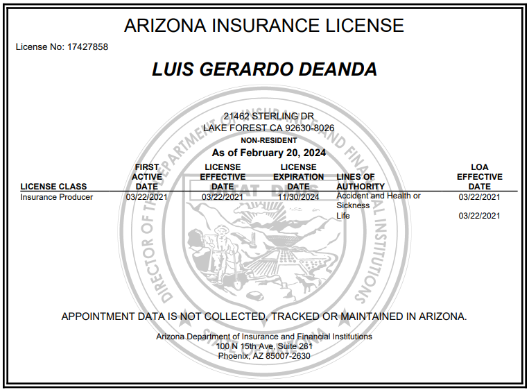 ARIZONA STATE INSURANCE LICENSE
